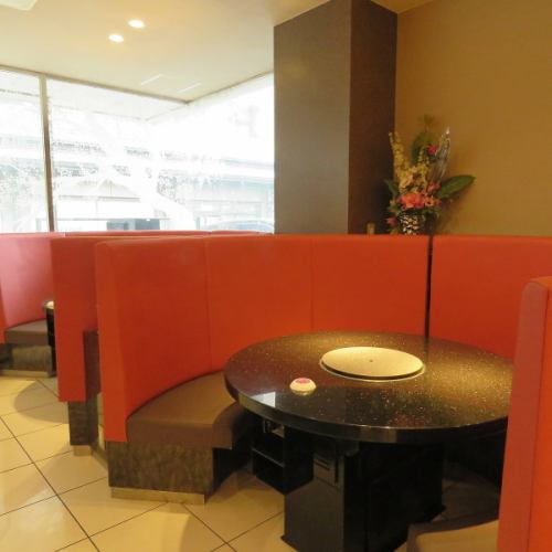 1階のソファー席は円卓と長卓とございます。ゆったり広々とお過ごしいただけます。いつもこの席希望の嬉しいお客様もいらっしゃいます。